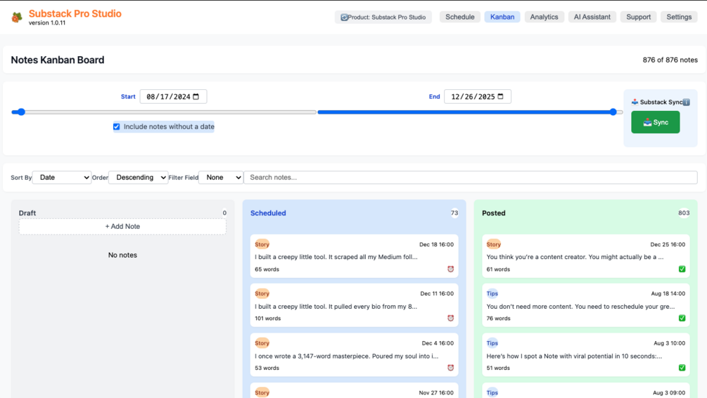 "I built this because I was frustrated with generic scheduling tools that didn't understand Substack's unique features. After 18 months of development and feedback from 690+ creators, this is the tool I use daily for my own Substack growth."